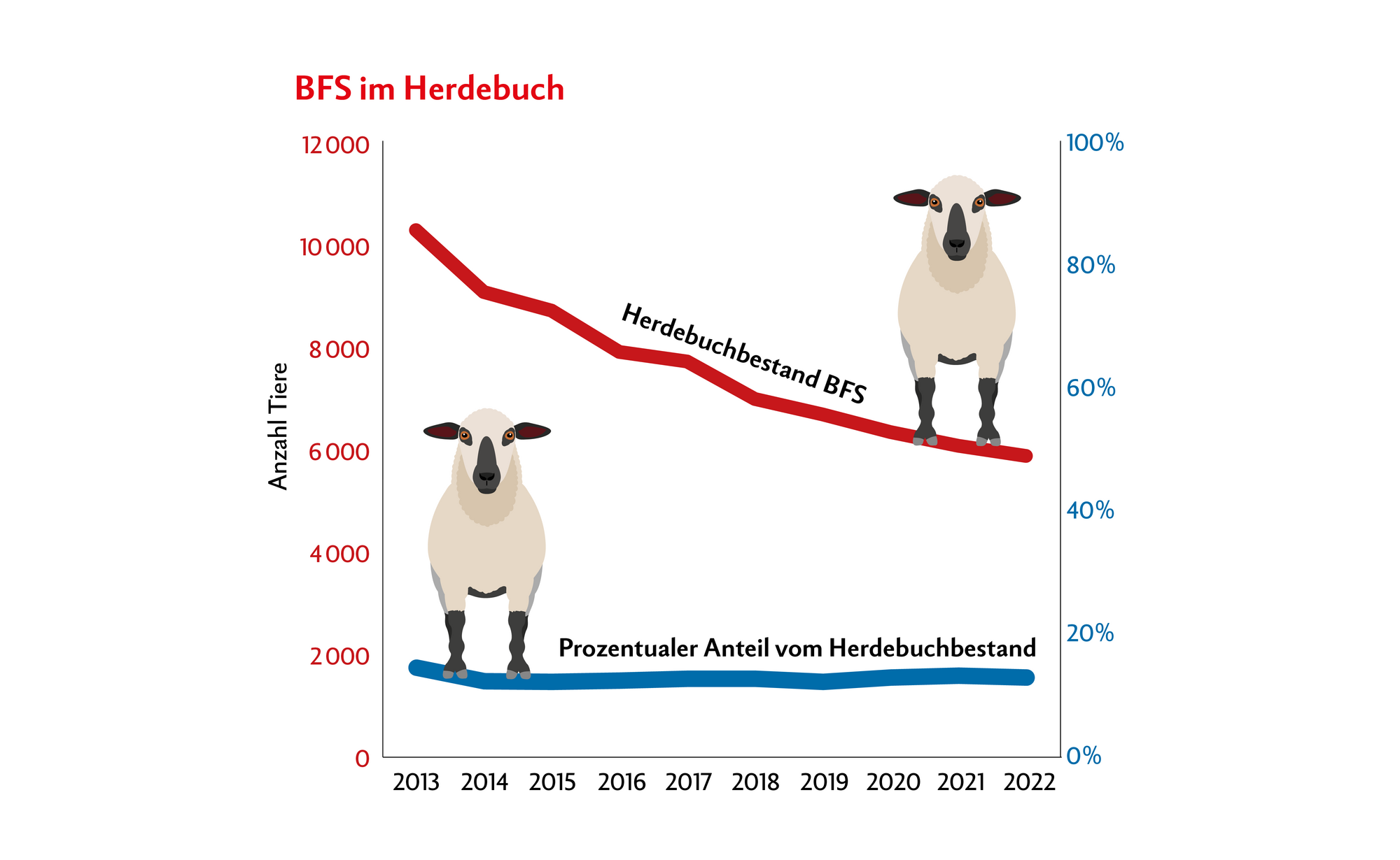 In den letzten zehn Jahren hat der Herdebuch-Bestand des Braunköpfigen Fleischschafs kontinuierlich abgenommen. Im Vergleich zu 2013 (10'306 Tiere) hat sich der Bestand 2022 mit 5905 Tieren halbiert.