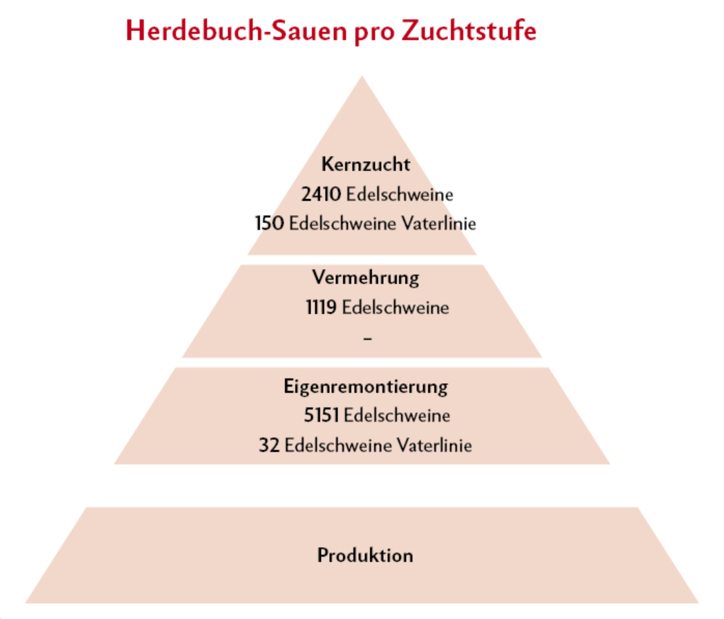 Die besten Jungsauen kommen auf den Vermehrungsbetrieb, wo sie gedeckt werden. Die dabei entstehenden Kreuzungssauen gehen in die Produktion. Die Vaterlinie wird direkt zur Produktion verwendet, muss also nicht vermehrt werden.