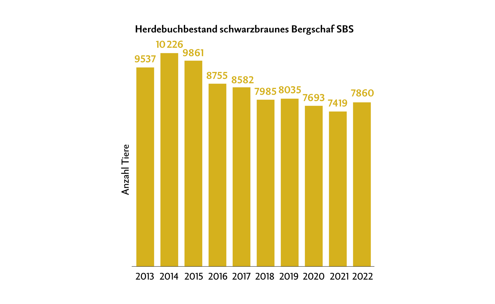 2022 waren 7860 schwarzbraune Bergschafe im Herdebuch registriert. In den letzten zehn Jahren hat dieser Herdebuchbestand zwar abgenommen. Doch der Rückgang war moderat, verglichen mit anderen Schafrassen, die gleichzeitig ebenfalls sinkende Zahlen aufwiesen.