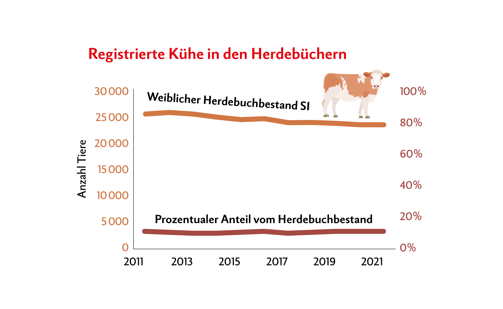 Der Bestand der Simmentaler Rasse bleibt relativ stabil – verglichen mit anderen Milchviehrassen. Eine Abnahme ist trotzdem zu verzeichnen: In den letzten Jahren sanken die Zahlen von 25'100 (2011) auf knapp 23'100 Kühe (2021) im Herdebuch.