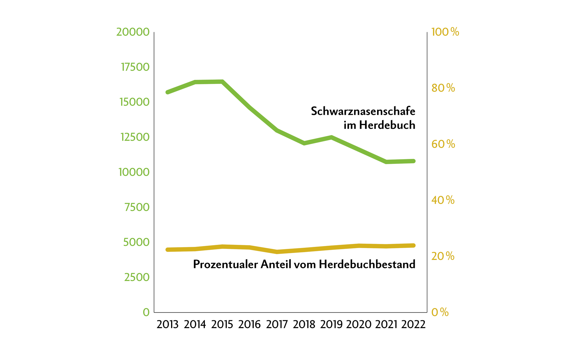 2022 waren knapp 10'800 Walliser Schwarznasenschafe im Herdebuch registriert. Damit hat die Rasse nach dem Weissen Alpenschaf den zweitgrössten Herdebuchbestand. Gut 20 % der Tiere im Herdebuch gehören zur Walliser Rasse.