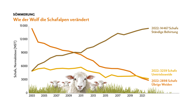 Die Präsenz des Wolfs schlägt sich in der Statistik nieder: Schafe werden auf den Sömmerungsbetrieben mehrheitlich behirtet, und zwar ständig. Das freie Weiden hat hingegen stark abgenommen, wie unsere Infografik zeigt.