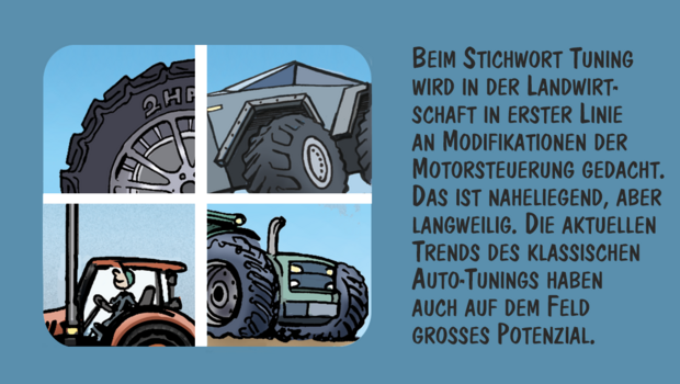 Cartoon von Marco Ratschiller/Karma: Trends des Auto-Tunings am Traktor