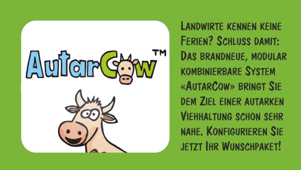 Landwirte kennen keine Ferien? Schluss damit: Das brandneue, modular kombinierbare System «AutarCow» bringt Sie dem Ziel einer autarken Viehhaltung schon sehr nahe. Konfigurieren Sie jetzt Ihr Wunschpaket!
