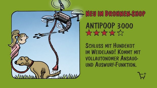 Cartoon von Marco Ratschiller/Karma: Neuigkeiten im Drohnenshop
